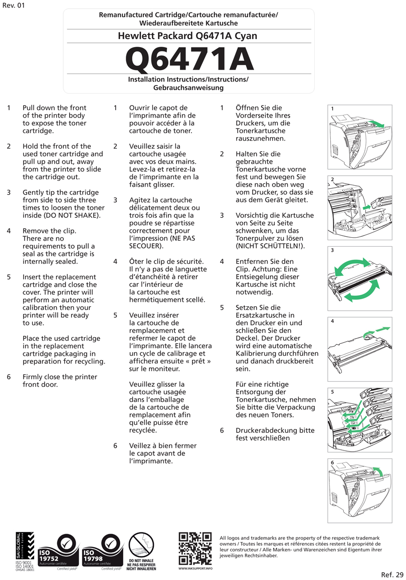 Your cartridge contains very fine powder called ‘toner’. Prior to installation gently rock the cartridge from side to side 2 to 3 times to allow the powder to move into position before printing. You will not need to repeat this process once the cartridge is installed as most cartridges contain a mechanical paddle which agitates the powder during the printing process.